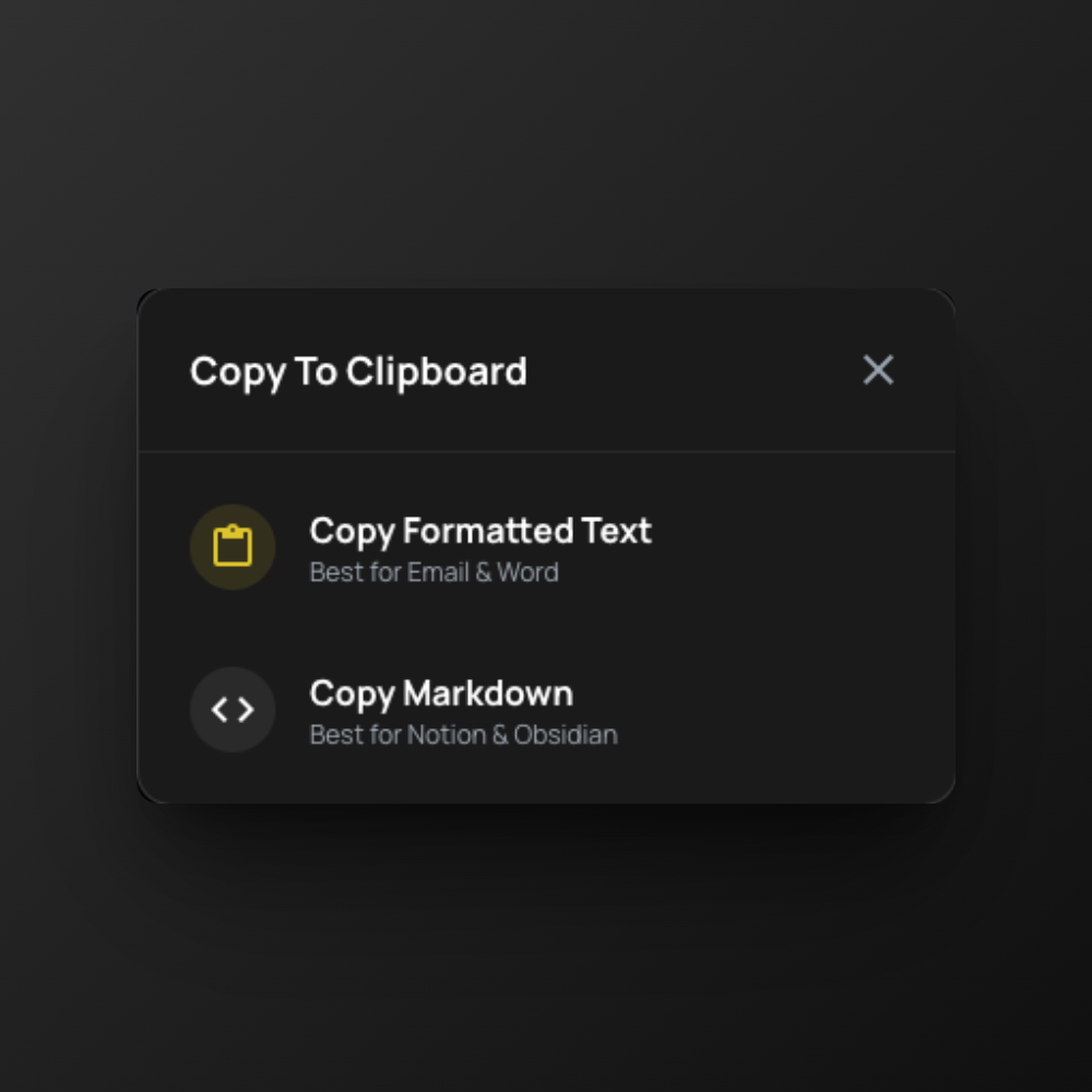 Copy Formatted Text—best for Email & Word. Copy Markdown—best for Notion & Obsidian. One tap, paste anywhere.