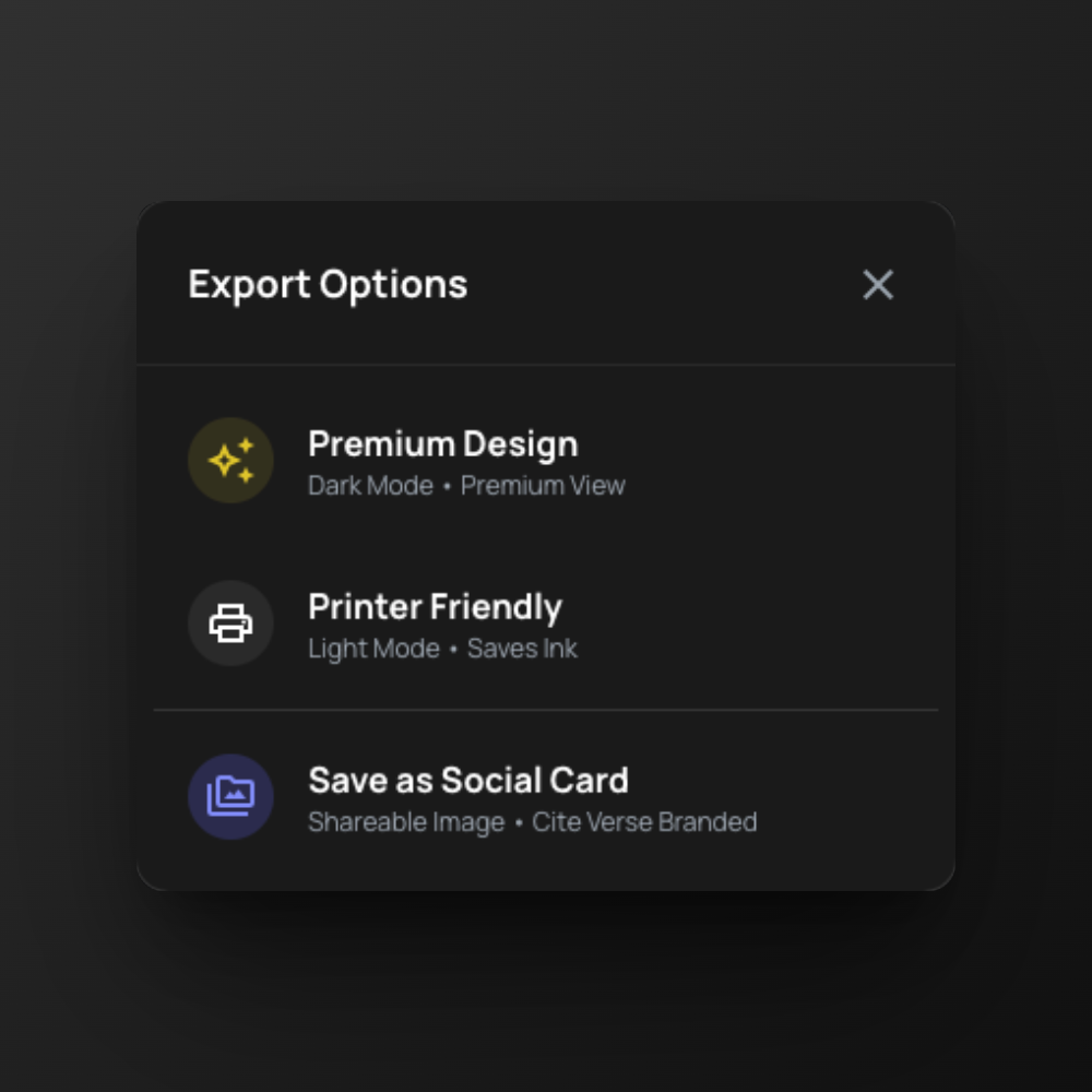 Premium Design—dark mode, premium view. Printer Friendly—light mode, saves ink. Or save as a shareable social card (Cite Verse branded).
